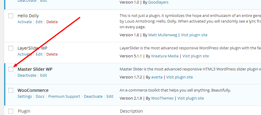 First of all, please note that you can't use this method with Master Slider.- Go to 'Appearance > plugin', deactivate Goodlayers plugins and delete them. :