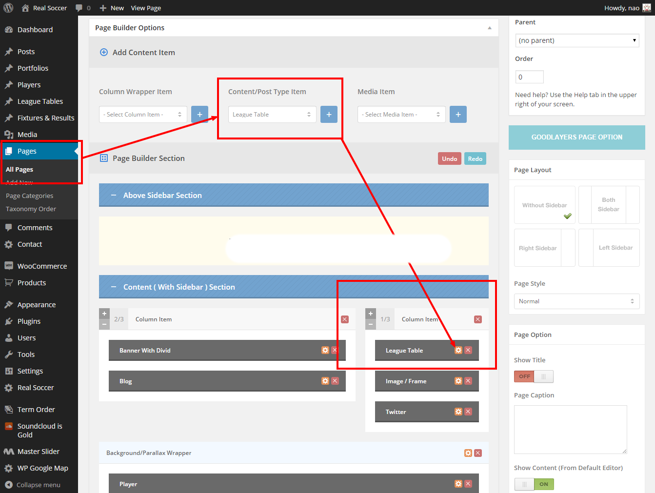3.) At the page you want, add the league item, select the item attribute ( gear icon ) then publish the page
